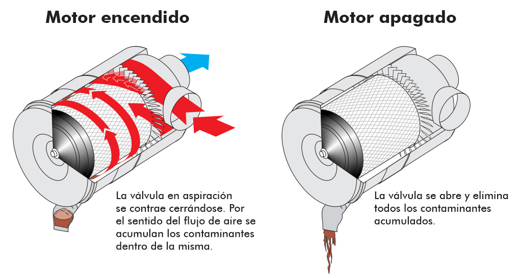 Las carcazas purificadoras para aire LANSS con válvula de drenaje autoeliminan el excedente de contaminantes acumulados durante el período de trabajo. Sus tapas sólo se abren para el mantenimiento programado o cuando el indicador de restricción lo indique. Se deben verificar las conexiones del sistema entre la salida del purificador a la entrada de aire al motor en cada mantenimiento.