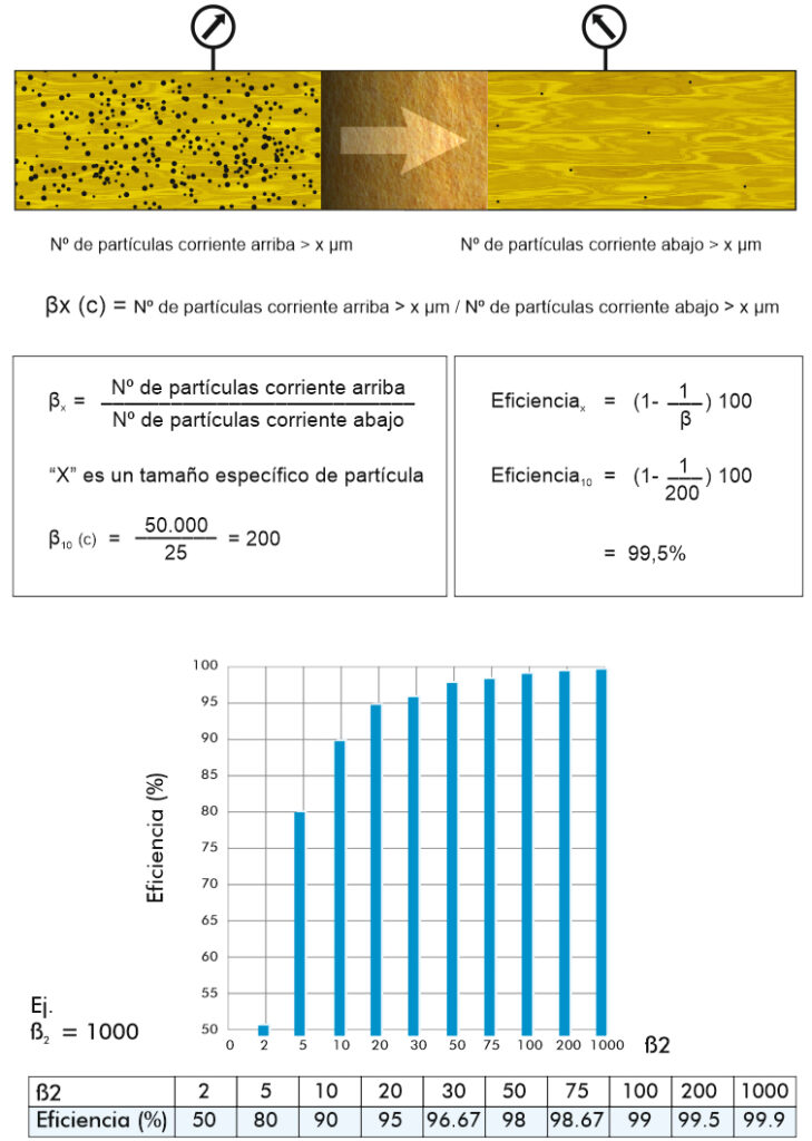 La razón beta es una fórmula para calcular el rendimiento de los medios filtrantes en remover partículas contaminantes, usando información de base provenientes de las pruebas de paso múltiples. Es simplemente una relación entre el conteo de partículas.